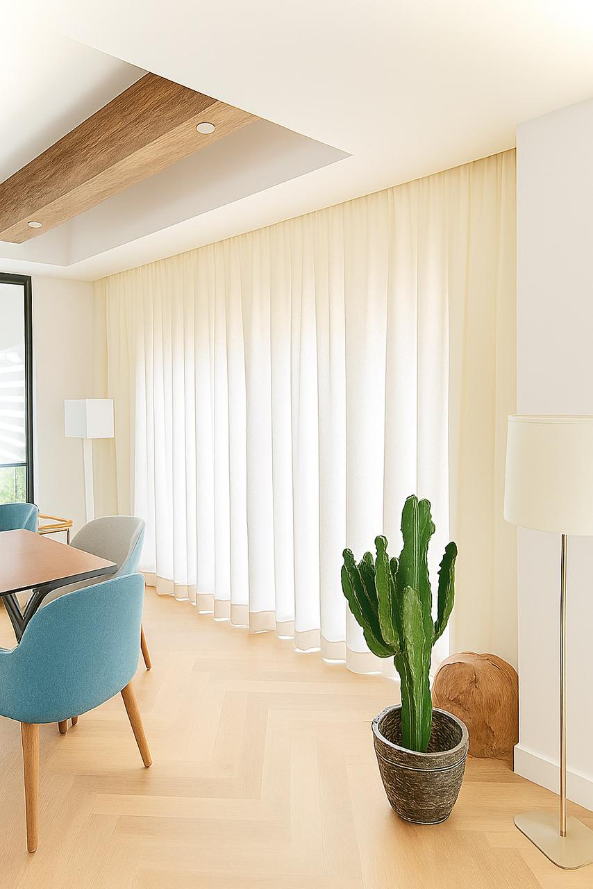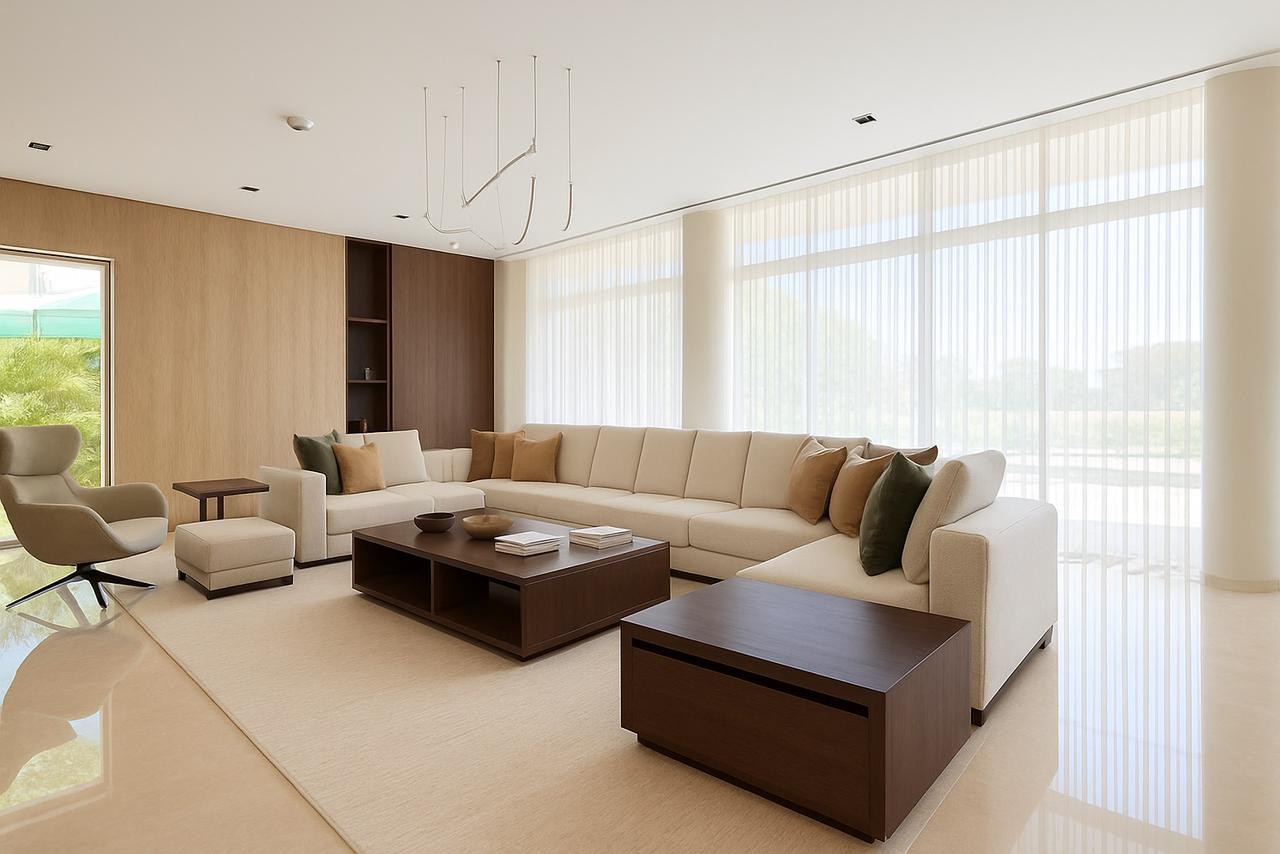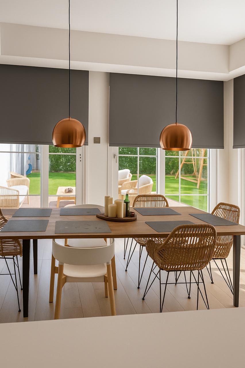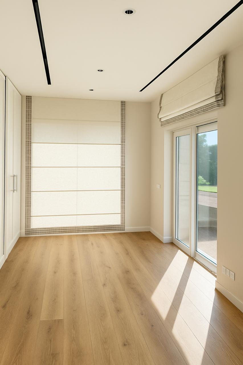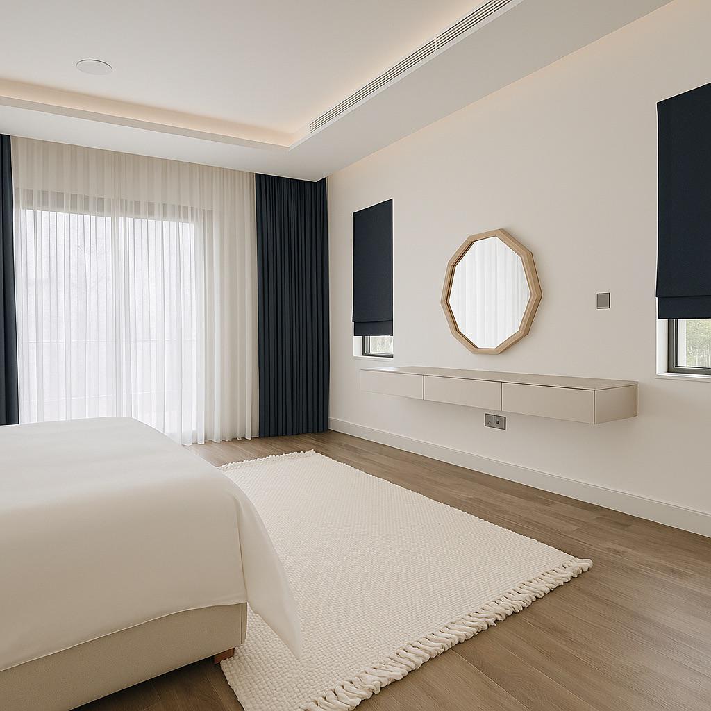 Motorized roller blinds bring elegance and comfort, letting natural light flow while maintaining privacy. Combined with the modern, stylish furniture, the space feels bright, inviting, and perfectly balanced