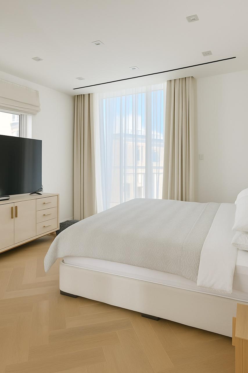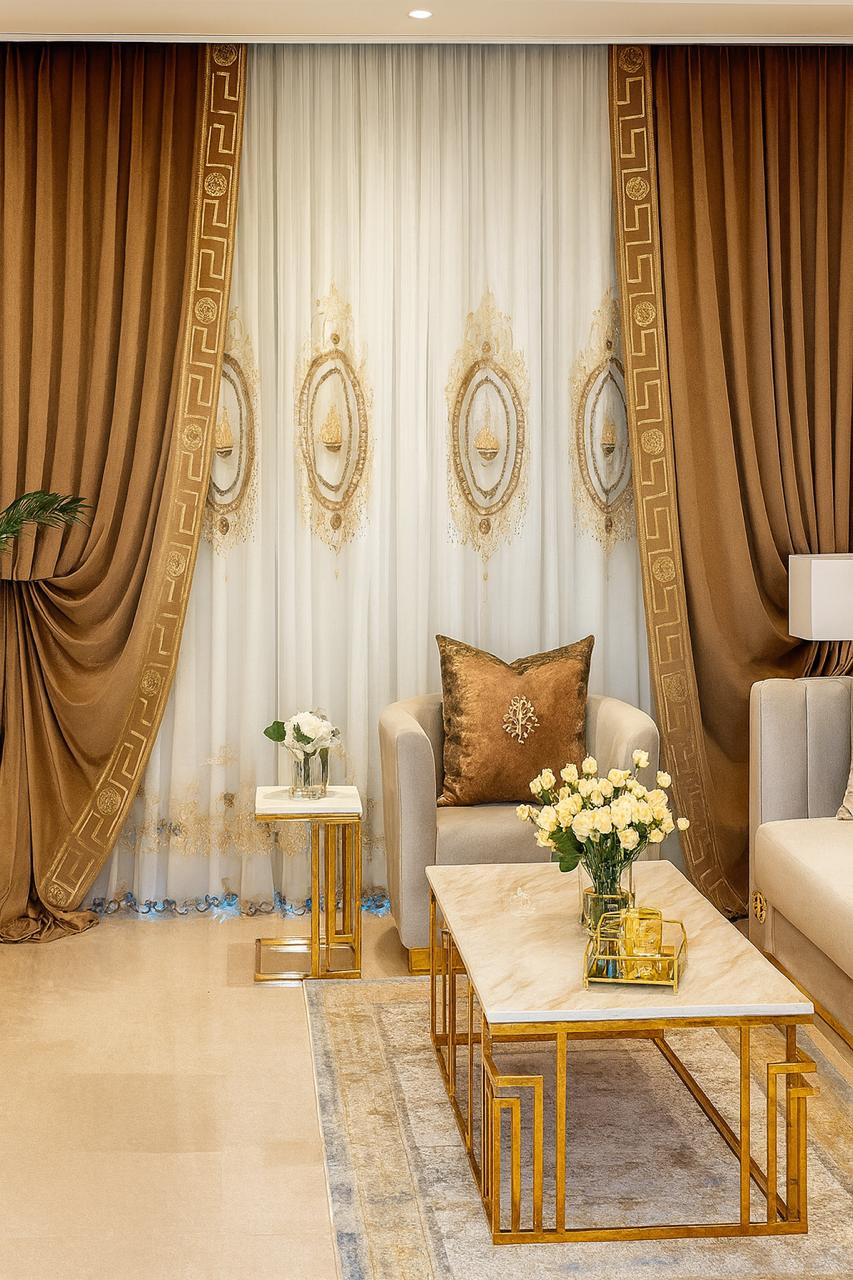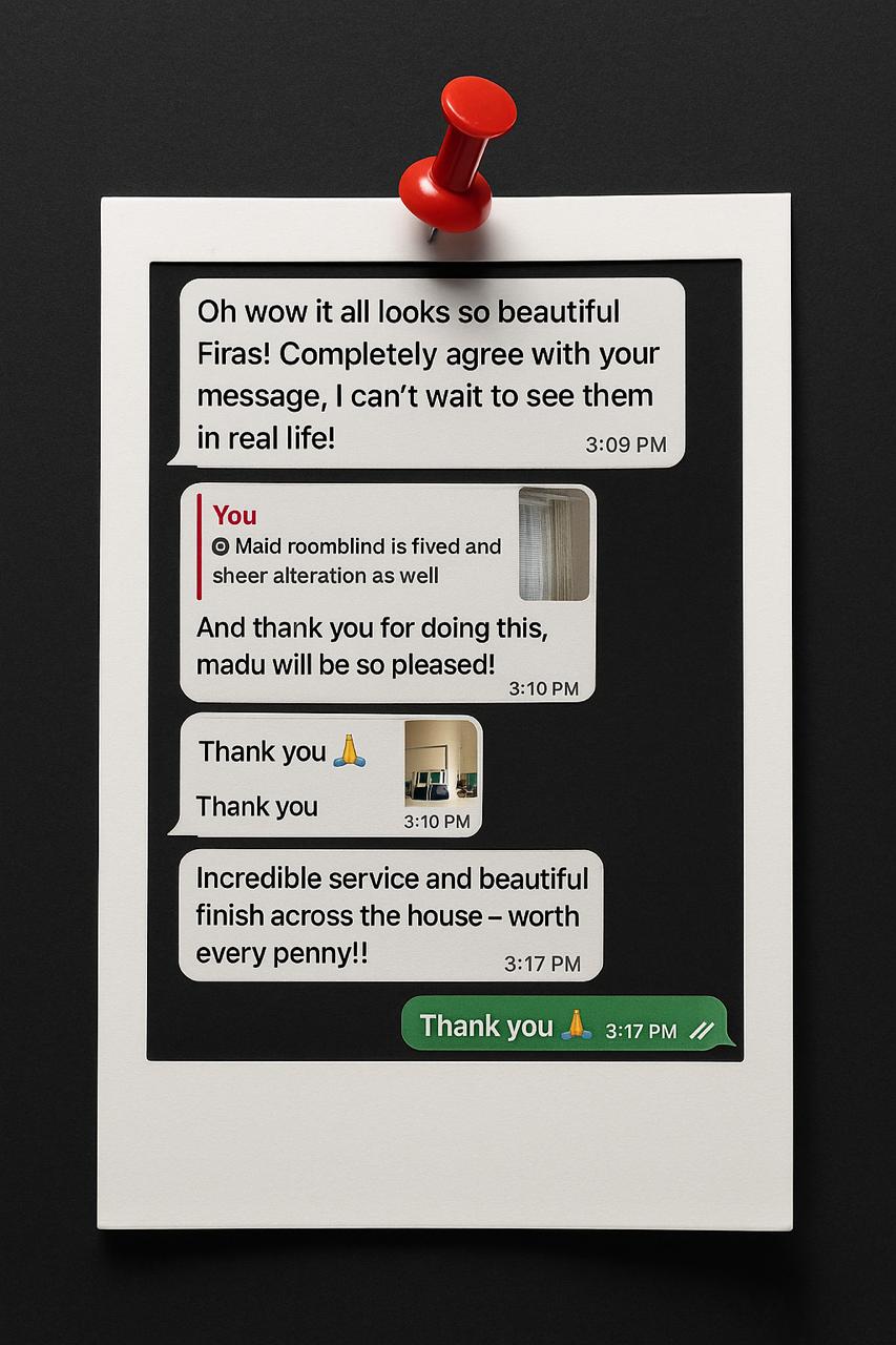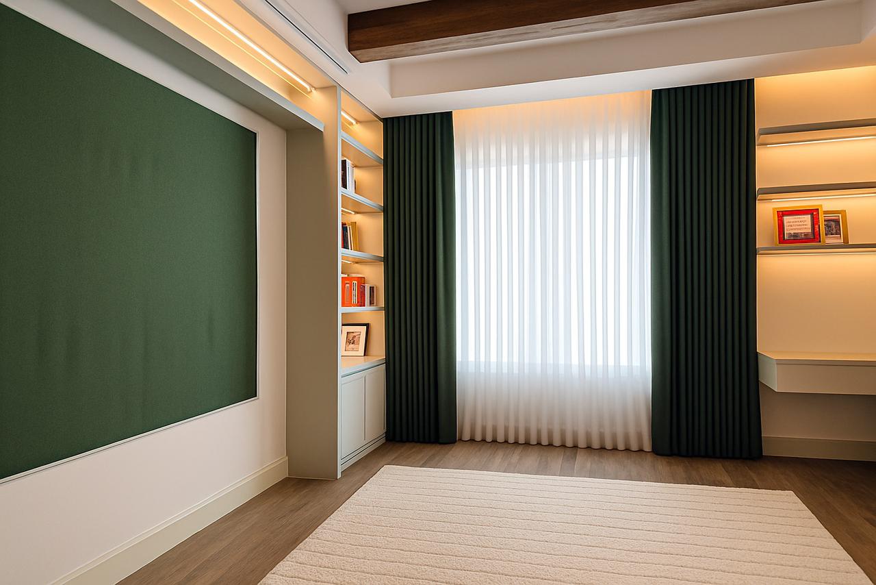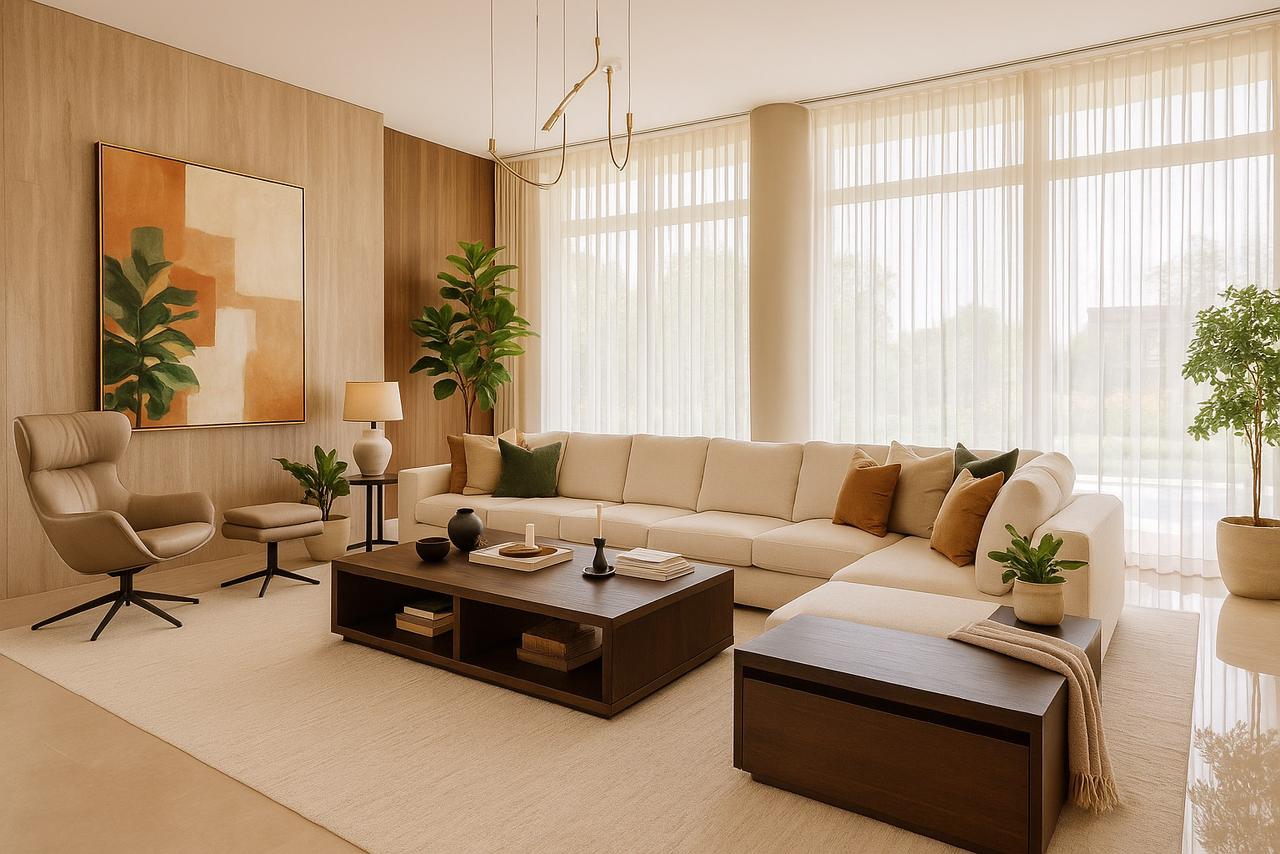 Motorized roller blinds bring elegance and comfort, letting natural light flow while maintaining privacy. Combined with the modern, stylish furniture, the space feels bright, inviting, and perfectly balanced