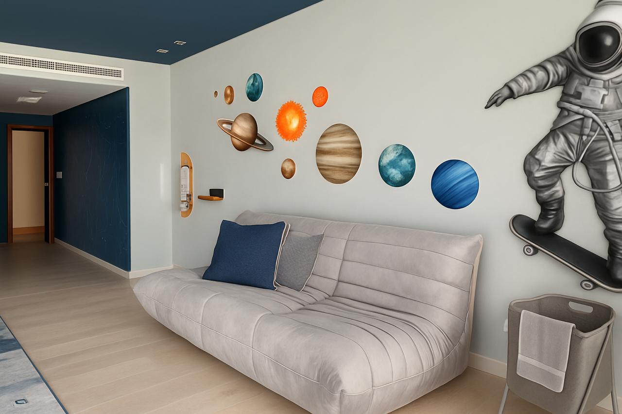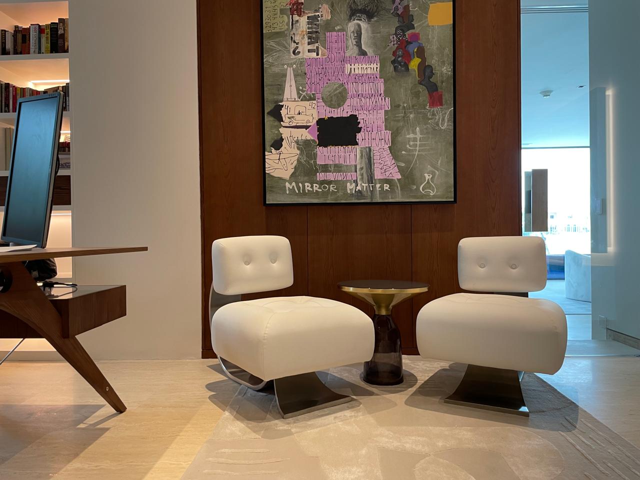 A refined living space where design vision meets craftsmanship. We brought the concept to life through customized furniture from the striking black chair to colorful poufs and tailored seating.